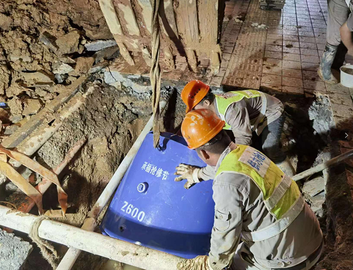 (凌晨時刻,搶修人員正在為破損水管安裝哈夫搶修器)