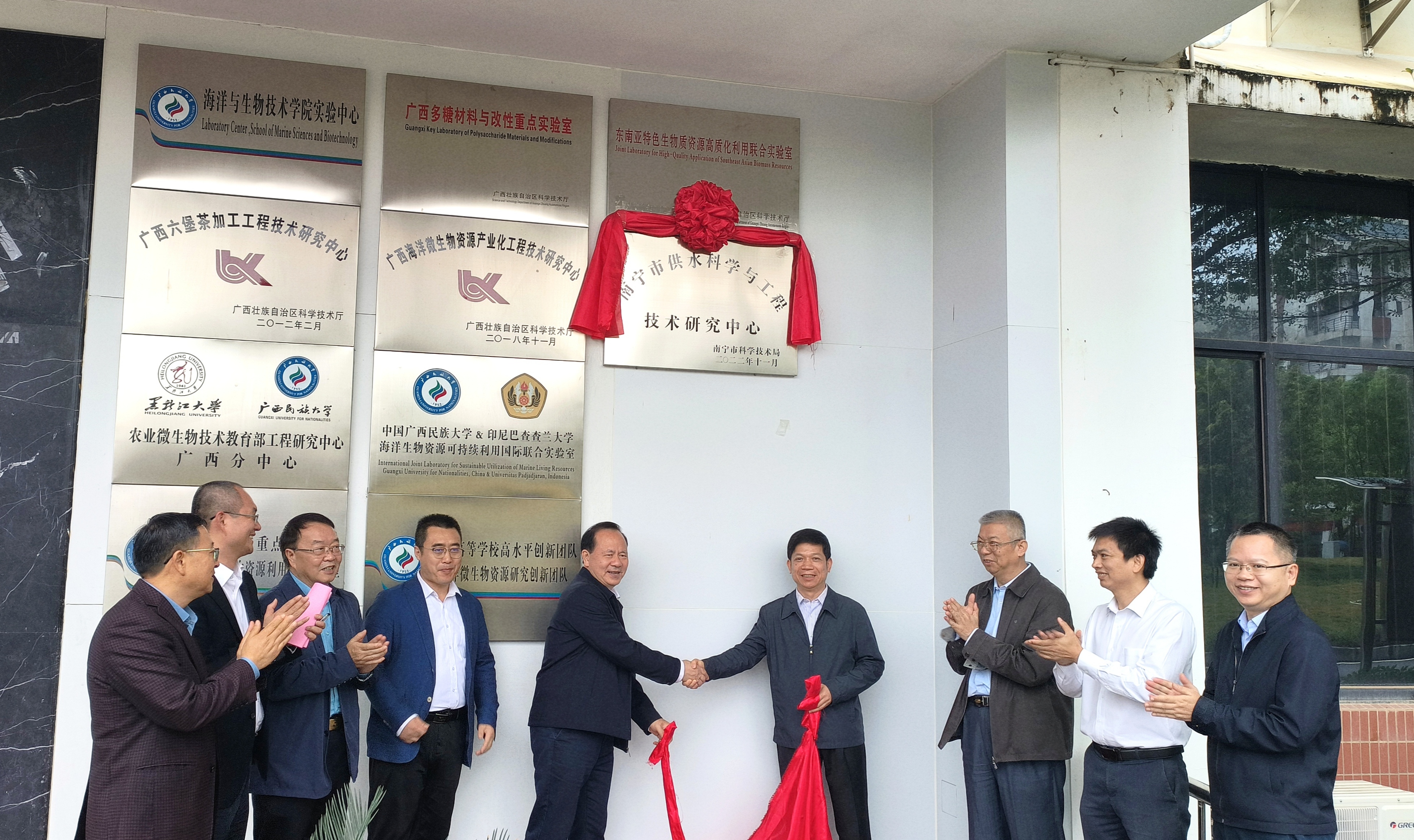 11月26日,由廣西綠城水務股份有限公司、廣西民族大學、中國科學院生態環境研究中心、廣西藍合創訊數據科技有限公司共同組建的南寧市供水科學與工程技術研究中心(簡稱“研究中心”),揭牌儀式在廣西民族大學相思湖校區化學化工學院隆重舉行。 廣西民族大學黨委副書記、校長謝尚果與廣西綠城水務股份有限公司黨委書記、董事長黃東海為該研究中心揭牌。