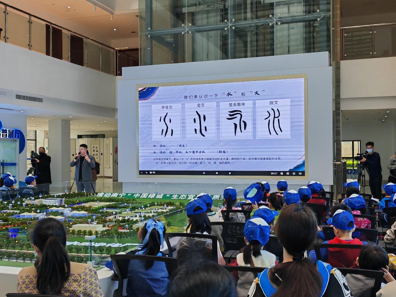 “‘水’這個字,從甲骨文到篆文,都以一個“s”形的線條表示蜿蜒流動的主水道。自古以來,水一直與人類生產生活息息相關,水可以用來灌溉,還可以用來滅火……”上午9時,在廣西廣播電視臺教育廣播主持人宇航生動有趣,貼近生活的講課中,活動拉開了序幕。