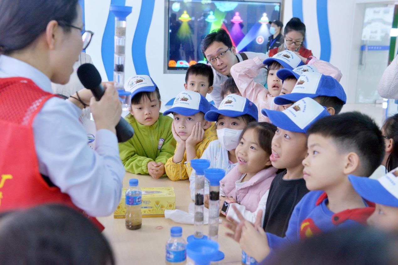 在水科普館,孩子們與講解員一起參與了水科學小實驗,通過親自動手操作凈水科學實驗,更直觀地感受到“干凈水”的由來。在垃圾分類宣傳陣地,孩子們利用陣地中的道具開展垃圾分類競賽游戲,在歡聲笑語中加深了對垃圾分類的認識。
